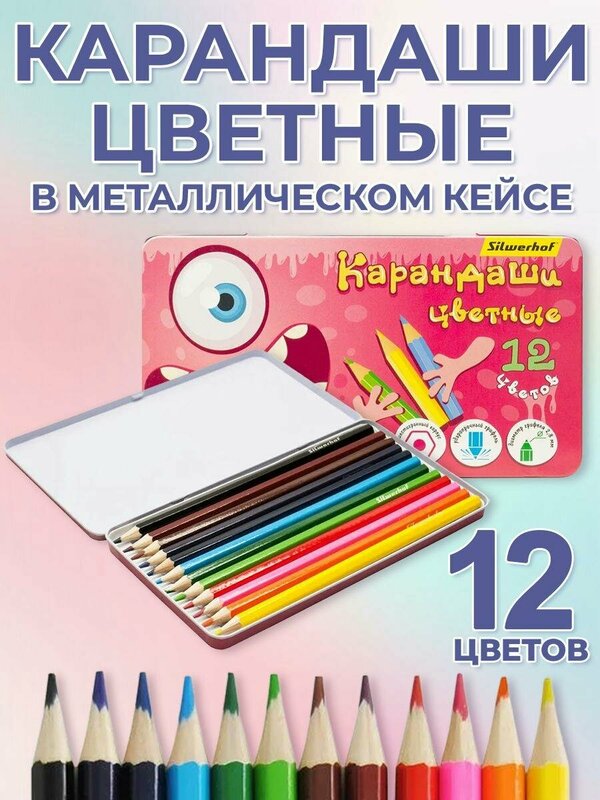 Набор цветных карандашей Silwerhof Монстрики с классическим шестигранным корпусом, изготовленным из дерева, заточенный грифель. Станет незаменимым творческим помощником для юных художников, благодаря мягкому и ударопрочному грифелю, диаметром 2,8 мм, мягкостью 2B. Прекрасно рисуют на бумаге и картоне. Карандаши легко затачиваются любой точилкой. В наборе 12 цветных карандашей. Упакованы в металлическую коробку.