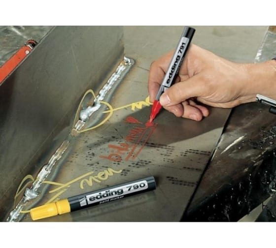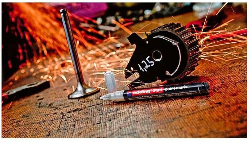 Экономичный универсальный маркер Edding 791 используется для промышленной непрозрачной маркировки практически всех материалов, например, стекла, пластика, дерева или металла. Может применяется для письма на жирных, пыльных, грязных поверхностях. Лаковый маркер устойчив к кислотам, растворителям, механическому истиранию, свету. Высококонцентрированный пигмент хорошо ложится на гладкие и шероховатые поверхности. Специальные добавки, введенные в состав маркера Edding E-791 растворяют, масляную пленку на поверхности письма. Непрозрачные лаковые чернила позволяют делать хорошо заметные надписи густым плотным слоем даже на темных поверхностях. Экономичный корпус промышленного маркера изготовлен из пластика. Маркер имеет упроченный круглый (пулевидный) наконечник. Наконечник маркера может быть заменен по мере истирания. Благодаря тонкому наконечнику маркером может наносится маркировка на небольшие элементы и поверхности. Толщина линии— 1-2 мм. Поток чернил регулируется клапаном. Чернила маркера с лакирующим эффектом на основе нитрокраски.