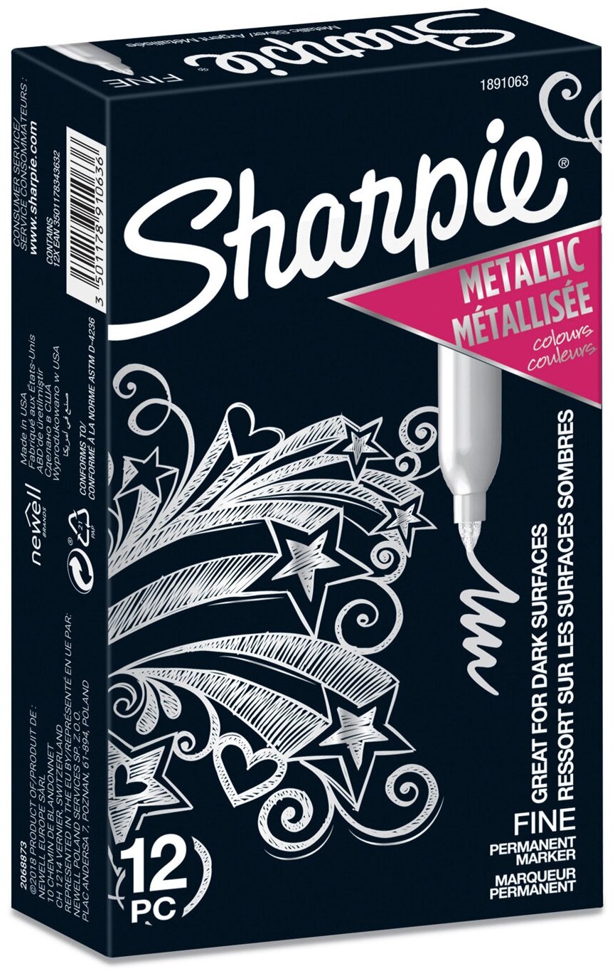 Набор из 12 штук Маркер перманентный Paper Mate Fine 1891063 Sharpie пулевидный наконечник 2мм, серебристый металлик.
