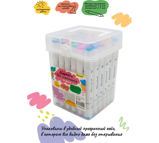 Набор маркеров для скетчинга SILWERHOF двойной пишущий наконечник 1-7 мм 36 цветов пластиковая коробка 36 шт 1509941 предназначен для нанесения надписей и рисунков. Быстро высыхают на бумаге, что экономит время и силы. Плотный колпачок надежно предотвращает высыхание. За счет эргономичного корпуса маркеры удобны в использовании. Технические характеристики Материал корпуса пластик Форма корпуса прямоугольная Цвет чернил ассорти Толщина линии письма 1 - 7 Водостойкие чернила да Быстросохнущие чернила да Диаметр корпуса 16 мм Двухсторонний да Количество в наборе 36 шт Лаковый нет Перманентный есть Габариты без упаковки 153х16 мм Вес нетто 1 кг Основа чернил спиртовая