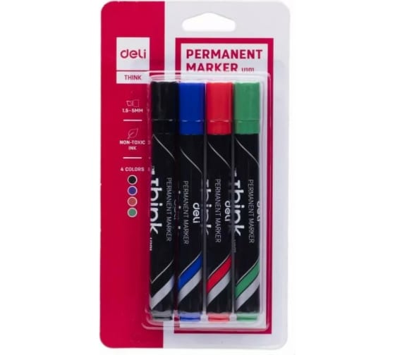Набор перманентных маркеров DELI Think EU10101 скошенный пишущий наконечник 1.5-5 мм 4 цвета пакет с европо, 24 упак 412190 предназначен для письма на различных поверхностях.