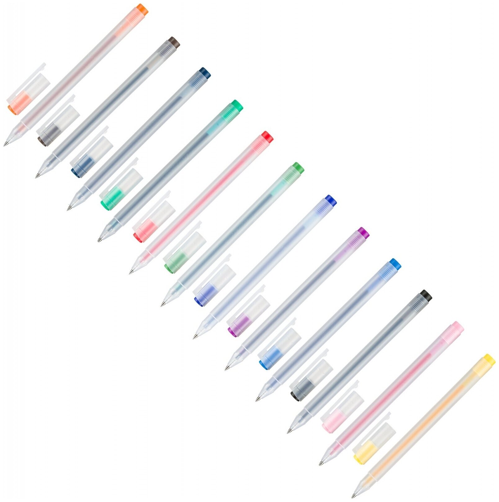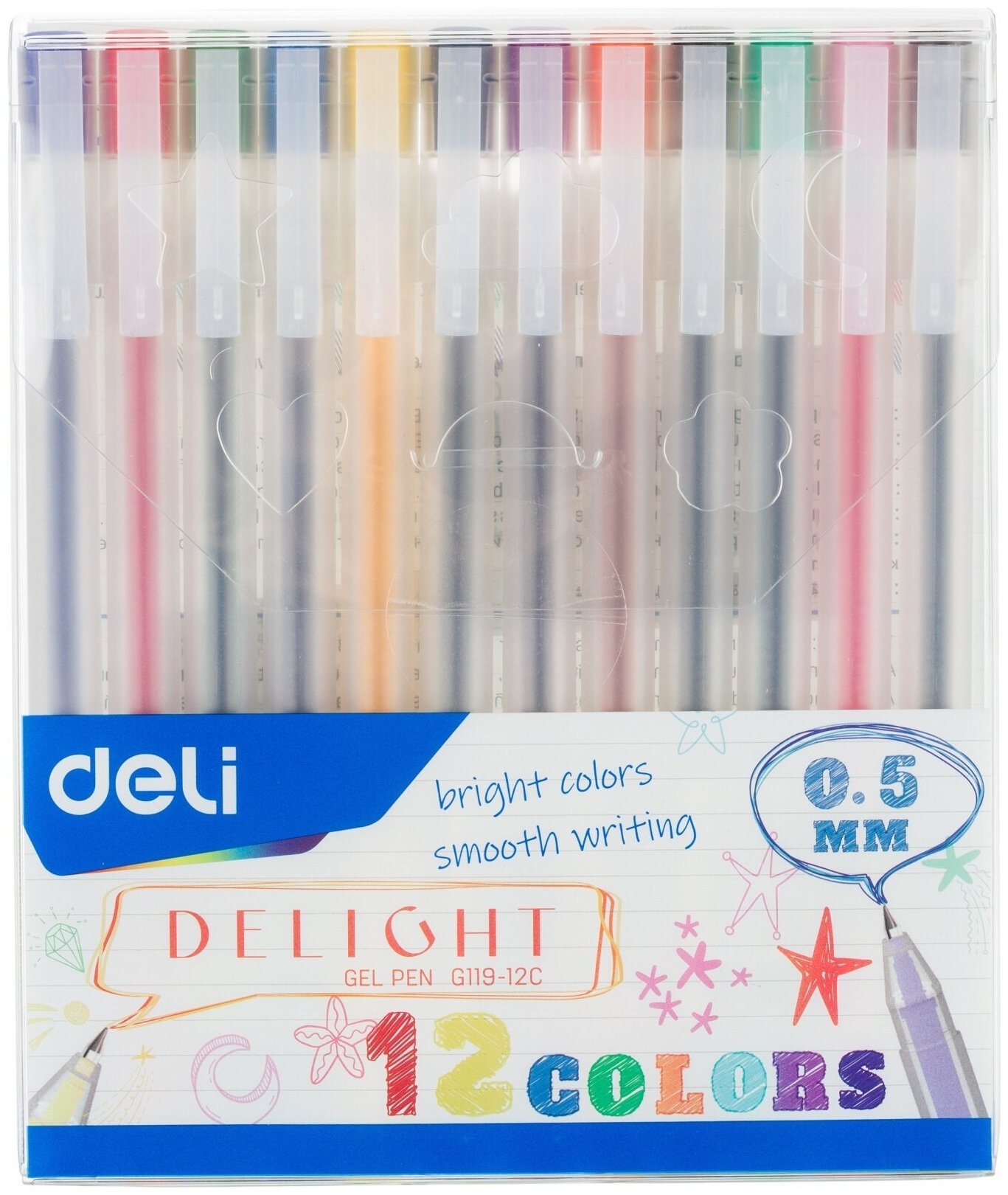 Набор гелевых ручек Deli, выполненных в приятном матовом пластиковом корпусе. Ручки имеют прочный металлический наконечник. В наборе ручки 12 цветов. Толщина линии — 0.5 мм. Ручками легко писать, они скользят по бумаге, обеспечивая мягкое письмо. Чернила быстро высыхают, не размазываются. Набор поставляется в прозрачной пластиковой упаковке, на которой имеется трафарет — ребенок с легкостью нарисует сердечко, цветок, звездочку, месяц и облако.