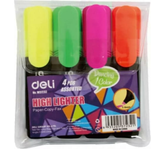 Набор текстовыделителей DELI E37232 скошенный пишущий наконечник 1-5 мм 4 цвета пакет с европодвесом, 12 упак 412281 предназначен для выделения информации.