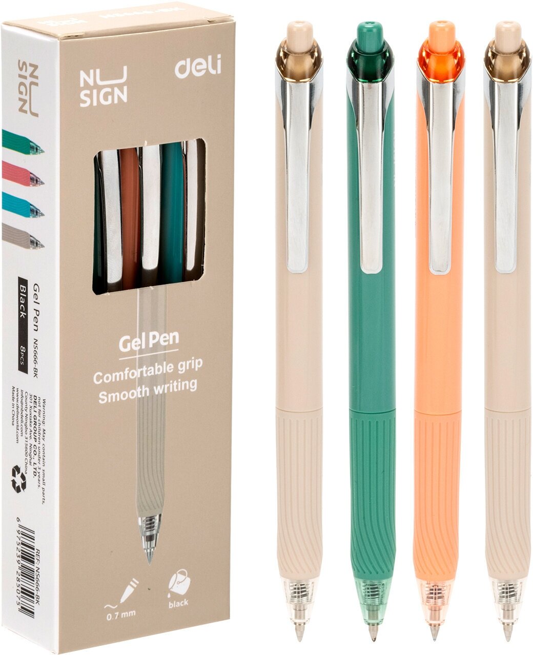 Ручка гелевая автоматическая Deli Nusign ENS666-BK корпус разноцветный чернила черные линия 0.7 мм, резиновая манжета, упаковка 8 шт.