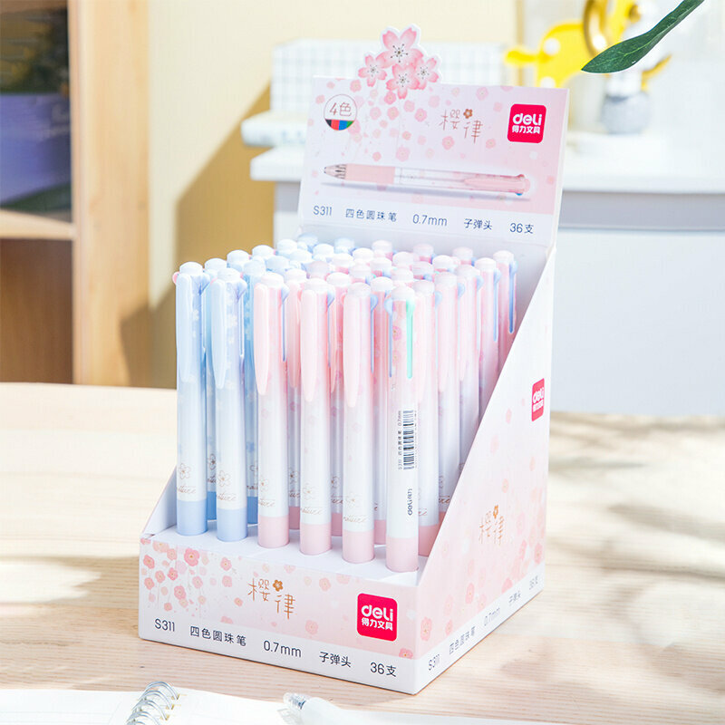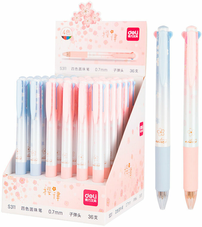 Ручка шариковая автоматическая Deli S311 корпус и чернила разноцветные, линия 0.7 мм резиновая манжета, упаковка 36 шт.