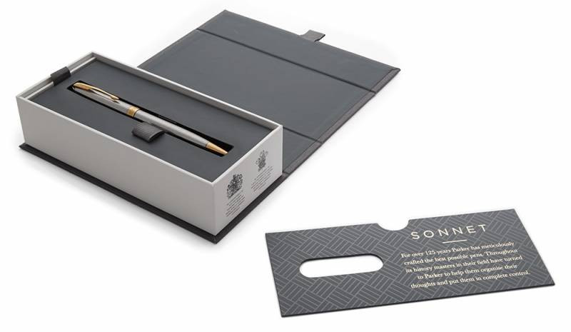 Отделка деталей: торец ручки: латунь покрытая золотом/зажим колпачка: сталь покрытая золотом/кольцо: сталь покрытая золотом