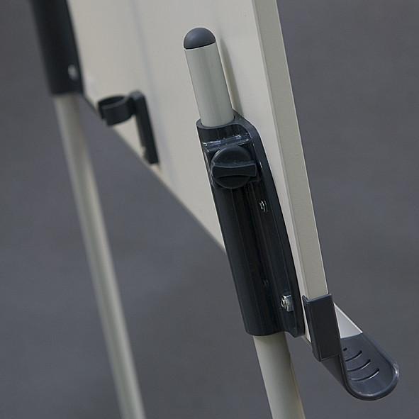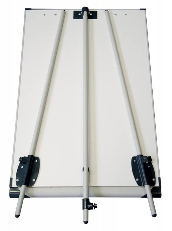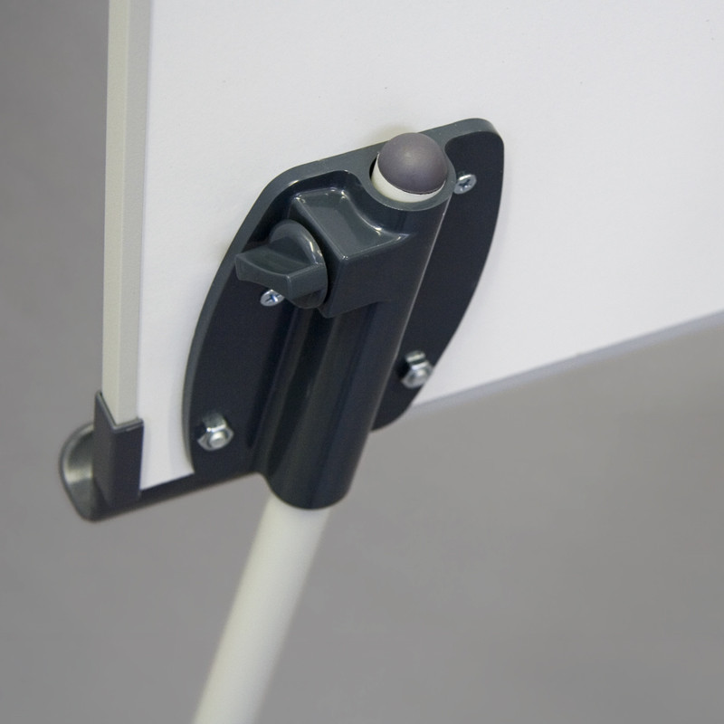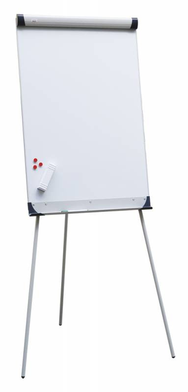 Описание: Сухостираемая доска в алюминиевой рамке. Треножная подставка из алюминия, лакированная в пепельном цвете, с регулировкой высоты (макс. 186 см). Универсальный держатель для блокнотов (регулируемое расстояние между крючками). Полка-желоб на маркеры. Отделка из пластмассы в графитовом цвете.