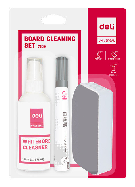 Описание: Набор для досок : спрей 100мл для очистки доски, 2 маркера ( черный и синий) стиратель для доски. Упаковка - блистер