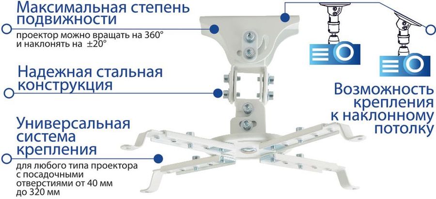 Описание Возможность крепления к наклонному потолку. Надежная стальная конструкция. Универсальная система крепления. Максимальная степень подвижности проектор можно вращать на 360 и наклонять на ±20 .