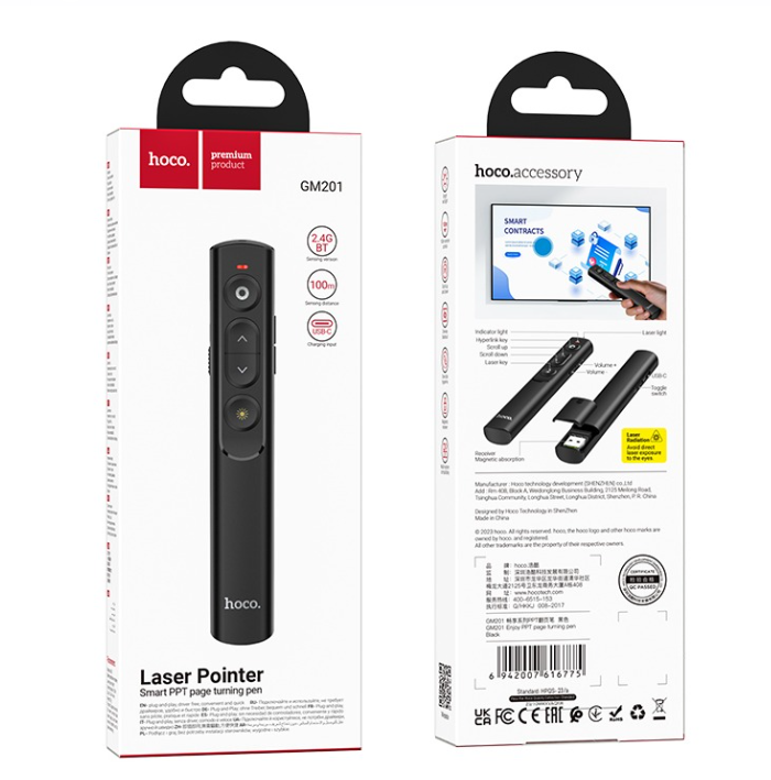 Это умная лазерная указка для грамотного и эффективного проведения презентаций. Этот компактный гаджет позволяет перевести внимание аудитории на конкретные элементы слайдов благодаря яркому красному свету, который выделяется на любом фоне. С его помощью также можно перелистывать страницы, открывать гиперссылки, регулировать громкость аудио, уменьшать и увеличивать размеры окон и изображений. Устройство не требует установки дополнительных драйверов или программ. Указка работает длительное время и заряжается с помощью кабеля Type-C. GM201 совместима с множеством устройств, предоставляя стабильное и быстрое подключение с частотой 2,4 ГГц.