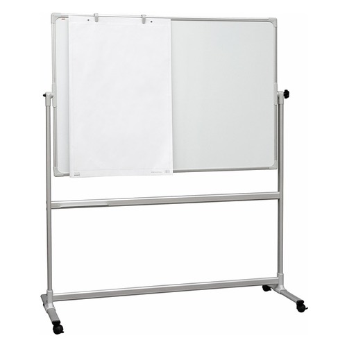 Описание: Износостойкая поверхность для письма сухостираемыми маркерами и прикрепления информации магнитами. Доска двусторонняя, возможность поворота доски на 360 градусов. Рукоятка для фиксации доски под нужным углом. Стильная подставка на колесиках с механизмом фиксации.