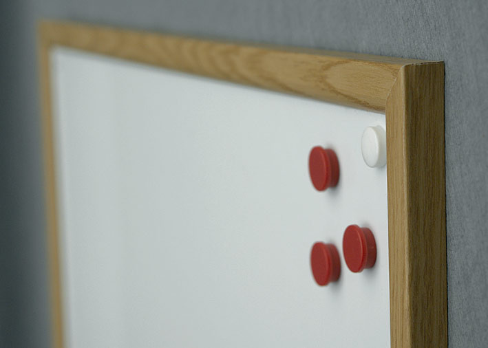 Описание: Износостойкая поверхность для письма сухостираемыми маркерами и прикрепления информации магнитами. Рамка из планки MDF дубовой расцветки. Крепление к стене в четырех углах.