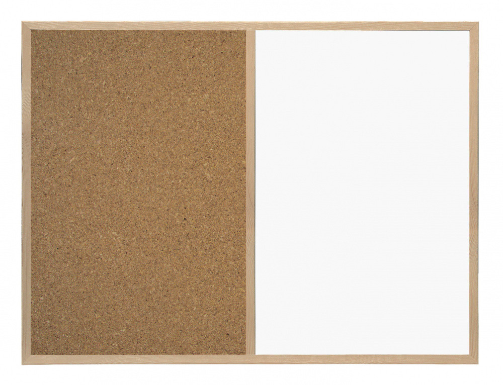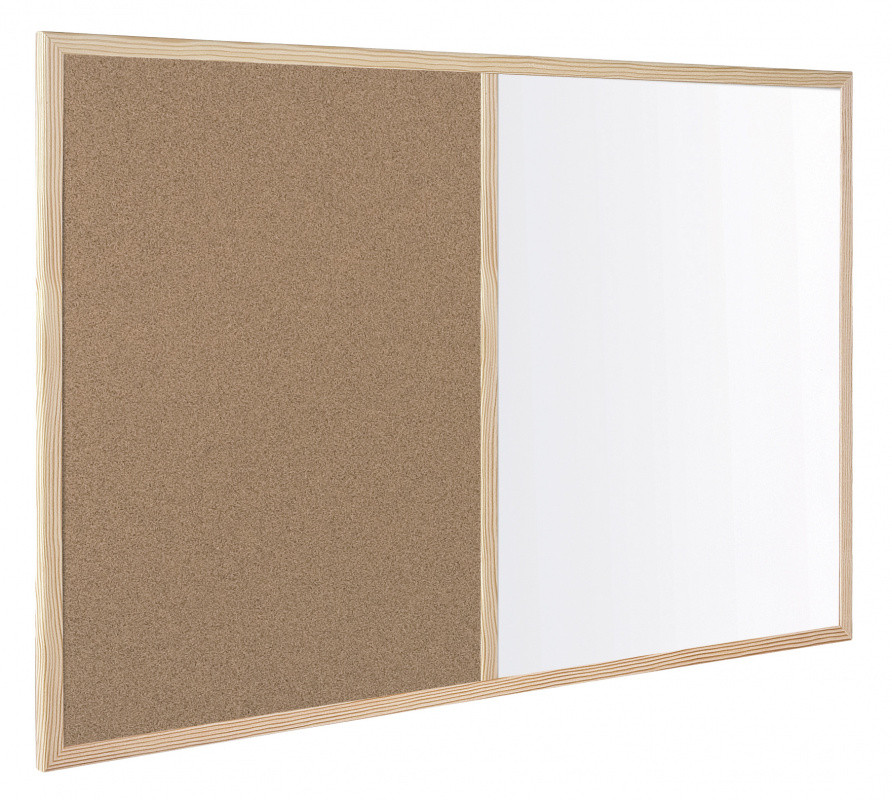 Описание: Комбинированная доска с пробковой стороной и стороной для маркеров сухого стирания. Обрамлена сосновой рамой.