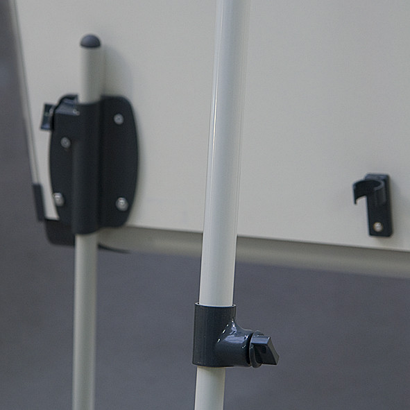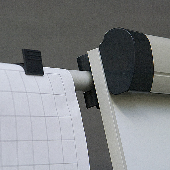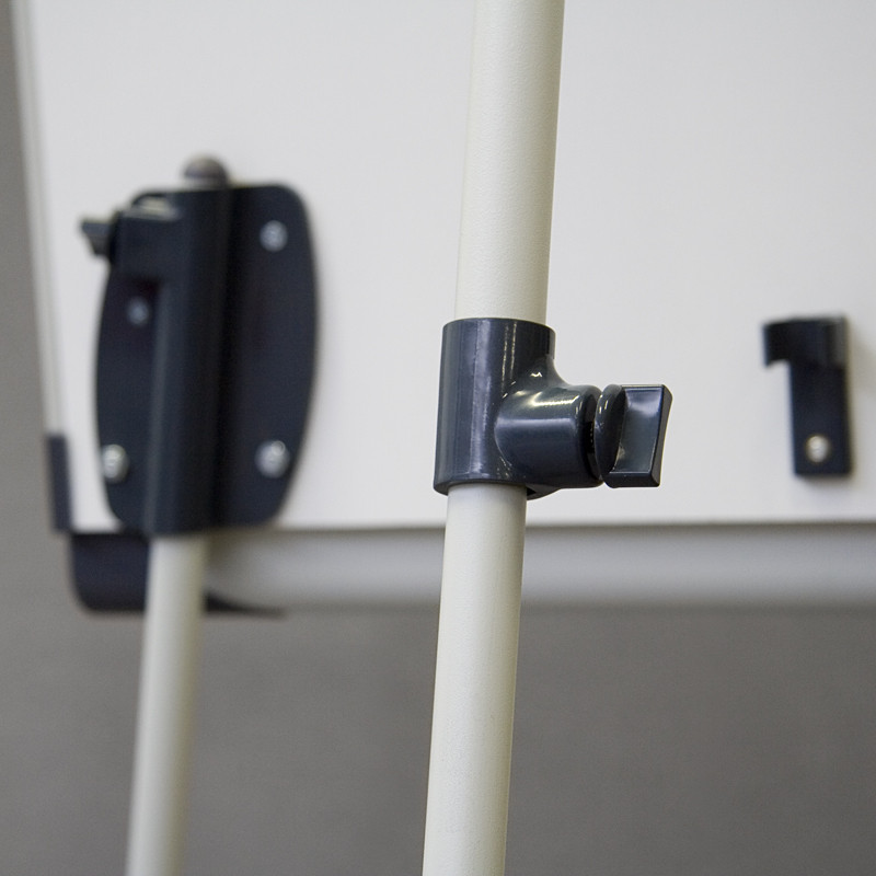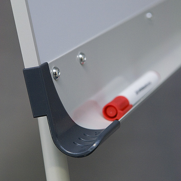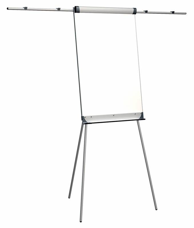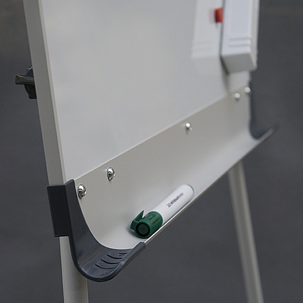 Описание: Сухостираемая доска в алюминиевой рамке. Треножная подставка из алюминия, лакированная в пепельном цвете, с регулировкой высоты (макс. 186 см). Универсальный держатель для блокнотов (регулируемое расстояние между крючками). Полка-желоб на маркеры. Отделка из пластмассы в графитовом цвете.