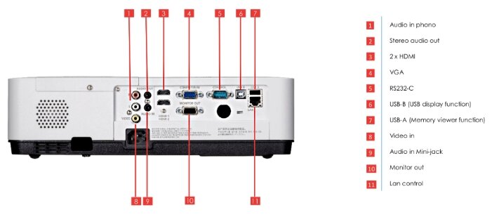 - VGA, HDMI x2, композитный, аудио mini jack, аудио RCA