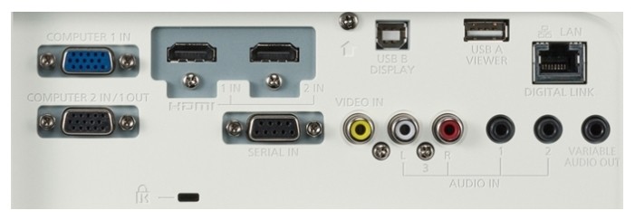 Интерфейсы входа: Wi-Fi, USB (тип A), USB (тип B), 2 x VGA (D-Sub), 2 x HDMI, RJ-45, RS-232, аудио mini Jack, аудио RCA, композитный