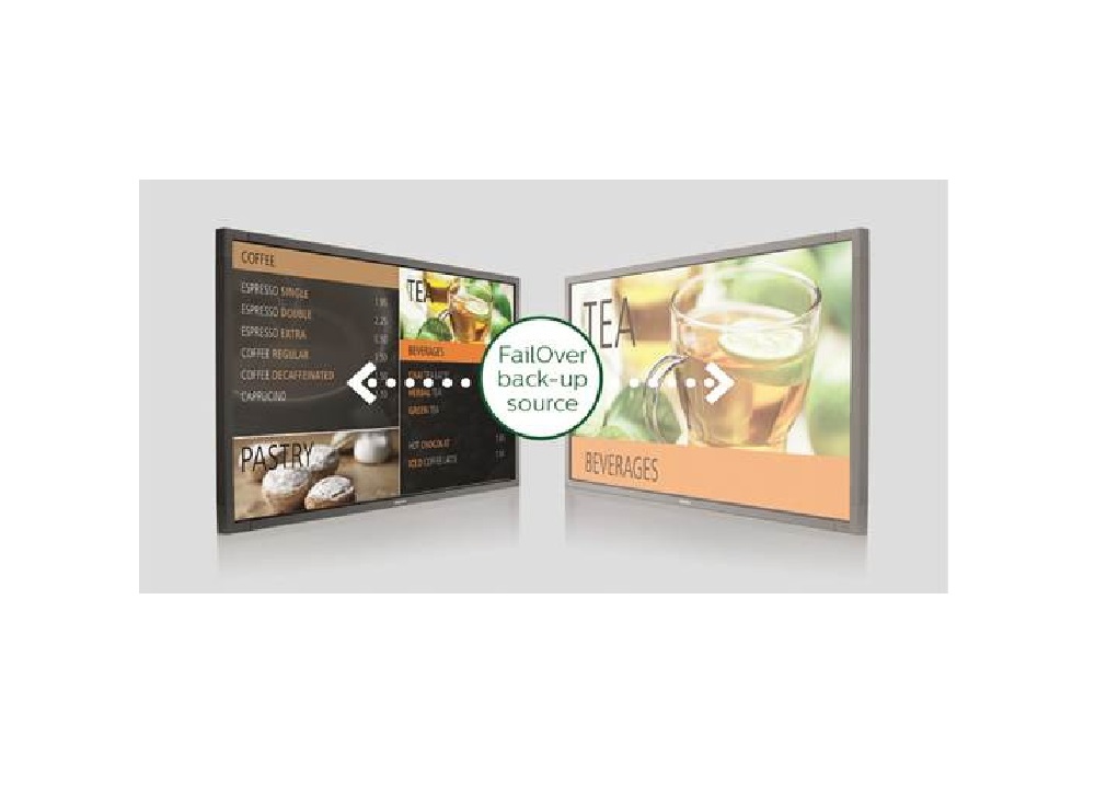 Неважно, где установлен дисплей — в вестибюле или конференц-зале, отсутствие изображения может стать настоящей проблемой. Функция FailOver позволяет профессиональному дисплею Philips автоматически переключаться между основным и резервным источниками, чтобы контент не переставал воспроизводиться при внезапном отключении основного источника. Просто настройте список альтернативных источников, чтобы экран всегда демонстрировал нужный контент.