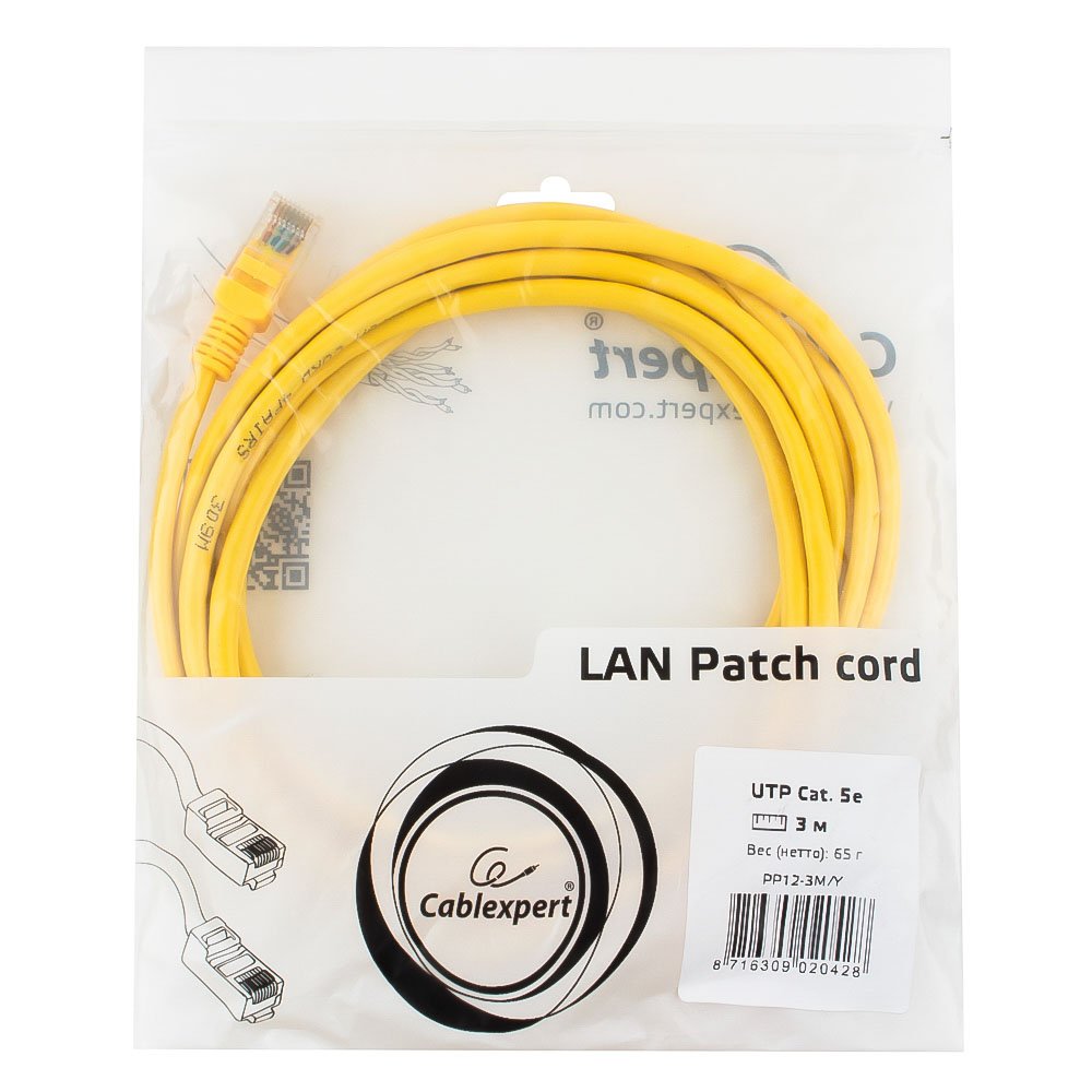 Патч-корд Cablexpert PP12-3M/Y UTP5e, 3 м, литой, многожильный, биметалл CCA, 26AWG, PVC, жёлтый