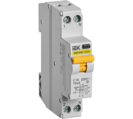 Автоматический выключатель дифференциального тока IEK АВДТ32ML тип A С16 10мА KARAT MVD12-1-016-C-010-A предназначен для защиты человека от поражения электрическим током при повреждении изоляции электроустановок, а также для защиты от перегрузки и короткого замыкания в сетях переменного тока напряжением 230 В и частотой 50 Гц.