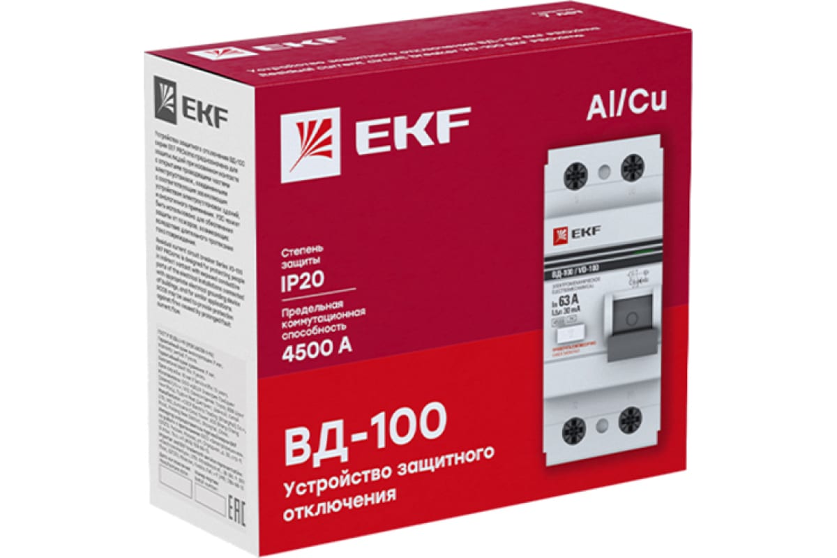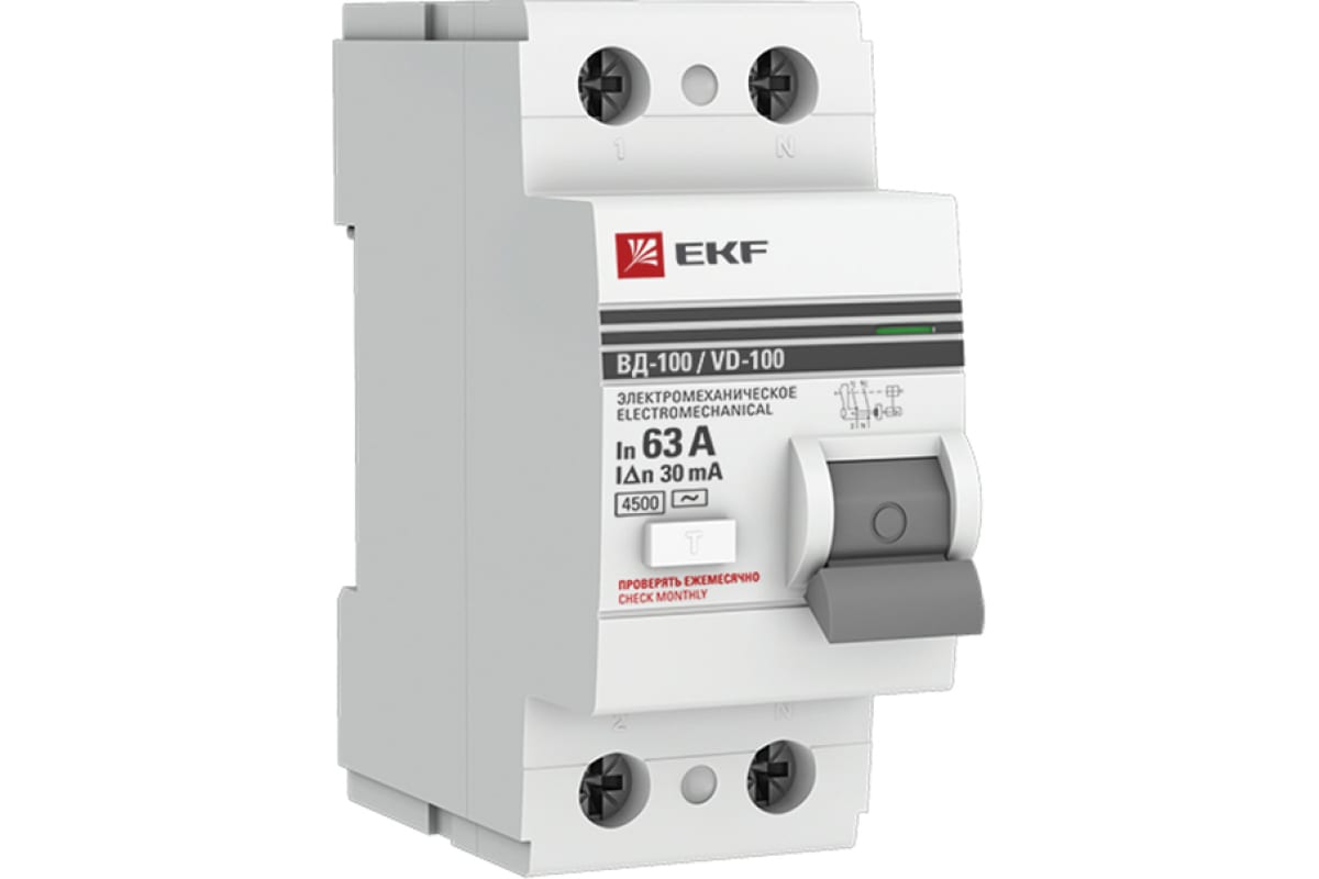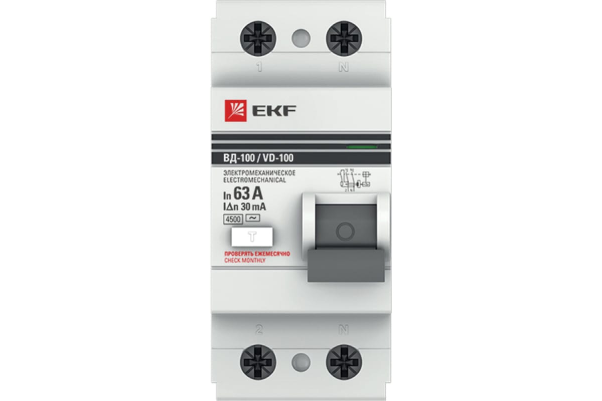 Технические характеристики EKF ВД-100 PROxima 2P 63А/30мА elcb-2-63-30-em-pro