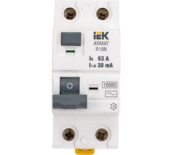 Выключатель дифференциального тока IEK ARMAT R10N 2P 63А 30мА тип AC AR-R10N-2-063C030 выполняет функцию защиты поражения человека электрическим током, а так же защиты от пожара при возникновении замыкания на землю.