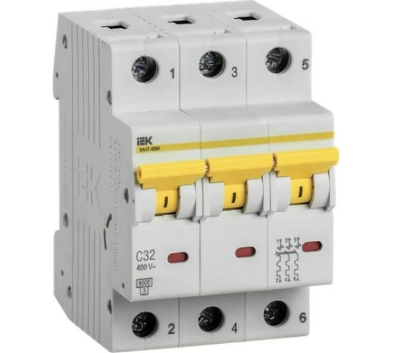 Автоматический выключатель IEK ВА47-60M 3Р 32А 6кА С MVA31-3-032-C выполняет функции автоматического отключения электроустановки при появлении сверхтоков и оперативного управления участками электрических цепей.