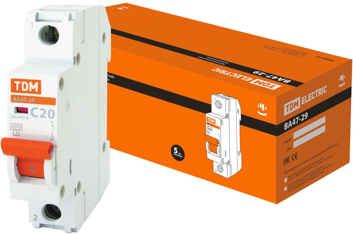 Технические характеристики TDM ВА47-29 1Р, 20 А, 4,5 кА, С SQ0206-0075