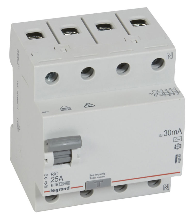 В импортном выключателе дифференциального тока Legrand RX3 (402062) предусмотрена надежная защита корпуса по IP 20 (от воды и попадания внутрь мелких предметов), что означает повышенные эксплуатационные характеристики. Величина номинального тока утечки составляет 30 мА, что является допустимым показателем. Выключатели популярной линейки отличаются длительным сроком использования.