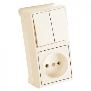 VERA Блок Выключатель двухклавишный+Розетка,вертикальный, кремовый Моноблок для наружнего монтажа VERA Блок Выключатель двухклавишный+Розетка,вертикальный, кремовый