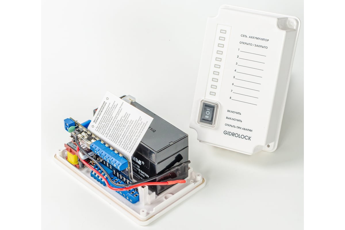 Управляет шаровыми кранами с электроприводами Gidrolock 12V и выдает звуковое оповещение при возникновении аварии в системах водоснабжения и отопления.