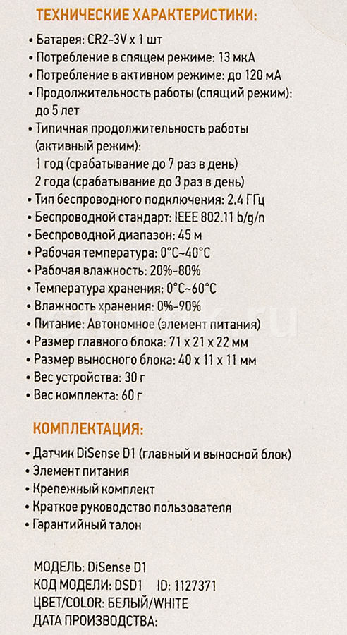 Комплект поставки Датчик (главный и выносной блок), элемент питания, крепежный комплект, руководство пользователя, гарантийный талон.