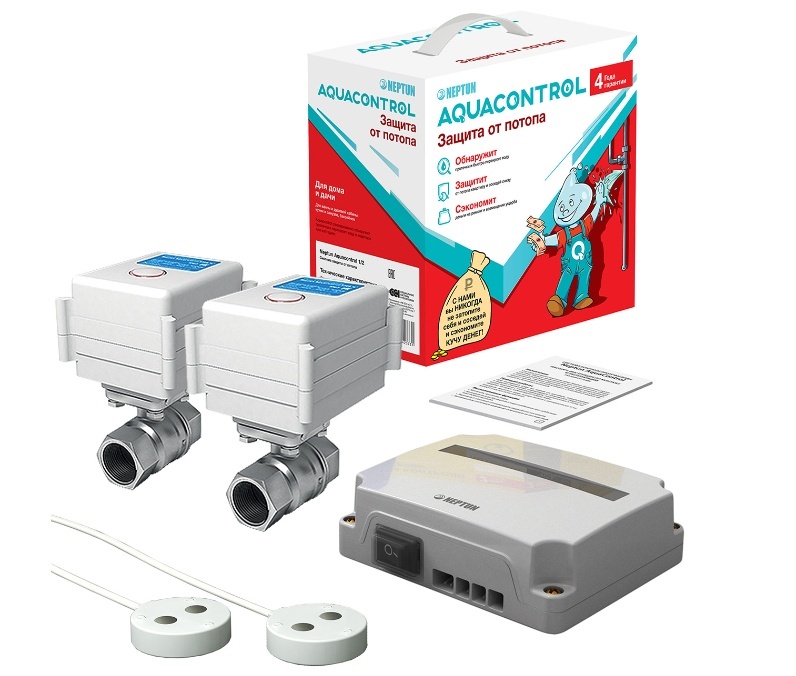 Система контроля протечки воды Neptun Aquacontrol 1/2 в автоматическом режиме отслеживает появление протечки и мгновенно перекрывает воду при возникновении аварийной ситуации в системе водоснабжения. Данная система надежно защитит от потопа имущество пользователя и соседей снизу, а также позволит существенно сэкономить деньги на новом ремонте и возмещении причиненного ущерба.