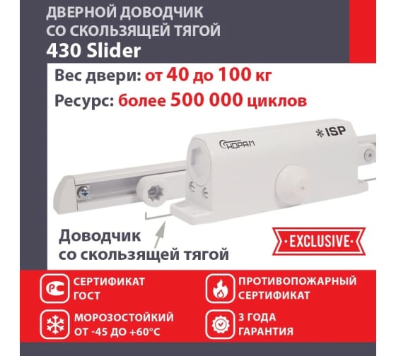Дверной доводчик НОРА-М Isparus 430 Slider скользящая тяга, для дверей до 110 кг, белый 18775 - морозостойкий дверной доводчик со скользящей тягой для дверей весом от 40 до 110 кг. с широким диапазоном рабочей температуры от -45 до +60 градусов по Цельсию.