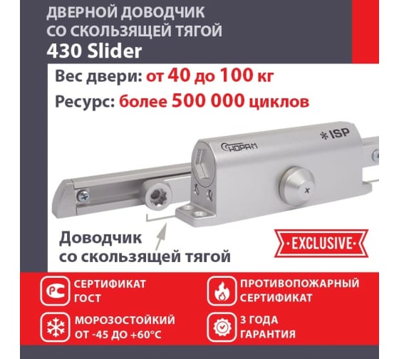 Дверной доводчик НОРА-М Isparus 430 Slider скользящая тяга, для дверей до 110 кг, серебро 18776 - морозостойкий дверной доводчик со скользящей тягой для дверей весом от 40 до 110 кг. с широким диапазоном рабочей температуры от -45 до +60 градусов по Цельсию.