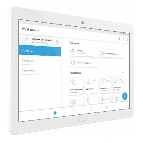 Комплект состоит из приемно-передаточного блока с антенной Wi-Fi и планшета, закрепляемого на стене. Приемник собирает и обрабатывает сигналы, поступающие от приборов и датчиков. Всю актуальную информацию пользователь получает и на телефон. Он может отдавать голосовые команды, создавать разные управленческие сценарии. Панель совместима с устройствами многих современных производителей.