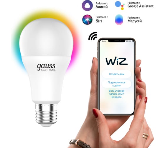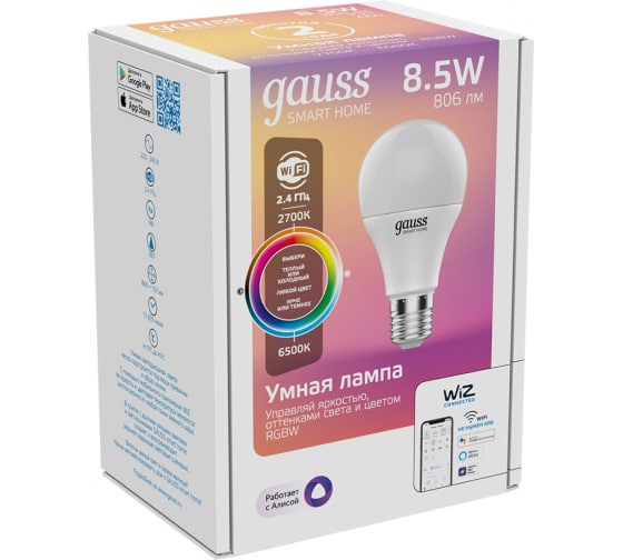 Умная Wi-fi лампочка Gauss, Smart Light RGBW E27 A60 8,5 Вт 2700-6500K, с изменением цвета, управление голосом/смартфоном 1170112: