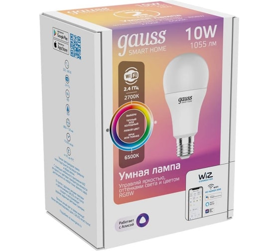 Умная Wi-fi лампочка Gauss, Smart Light RGBW E27 A60 10 Вт 2700-6500K, с изменением цвета, управление голосом/смартфоном 1180112: