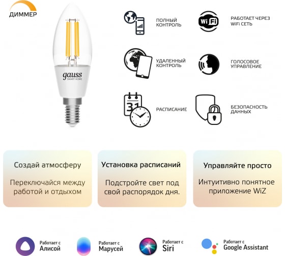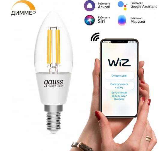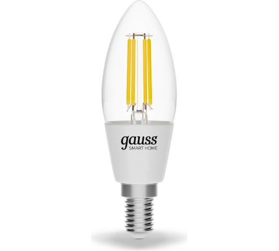 Умная Wi-fi филаментная лампочка Gauss, Smart Light DIM E14 C35 4,5 Вт 2700-6500K, диммируемая, управление голосом/смартфоном 1230112: