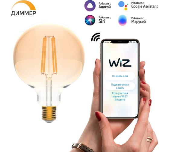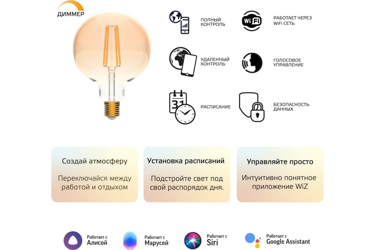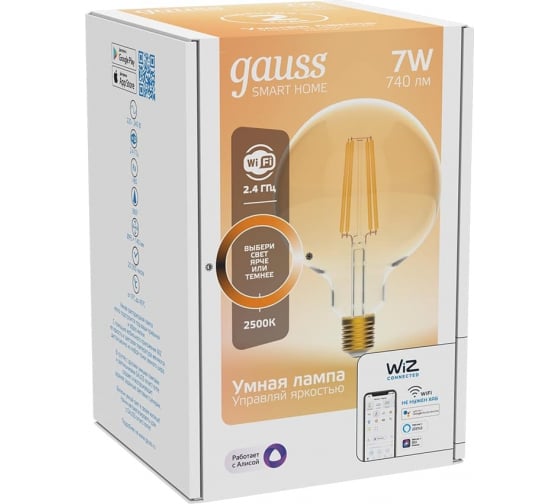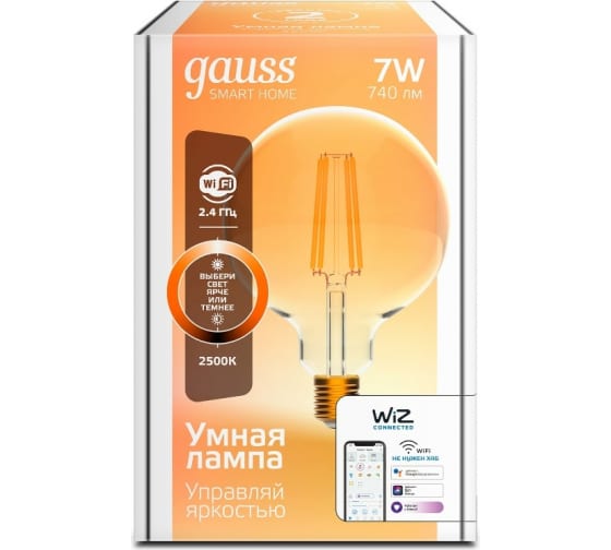 Умная Wi-fi филаментная лампочка Gauss, Smart Light DIM E27 G95 7 Вт 2700-6500K, диммируемая, управление голосом/смартфоном 1320112: