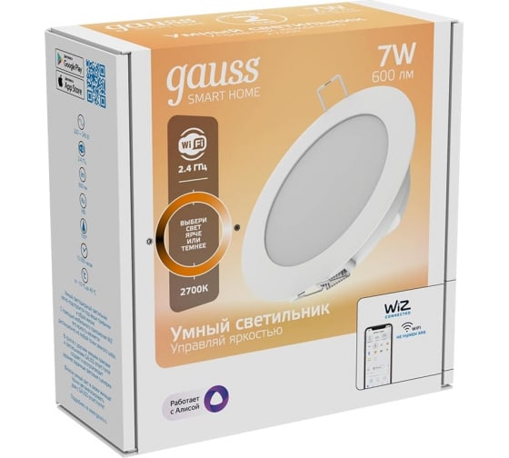 Умный Wi-fi встраиваемый светильник Gauss, Smart Light DIM 7 Вт 2700-6500K, диммируемый, управление голосом/смартфоном 2010122: