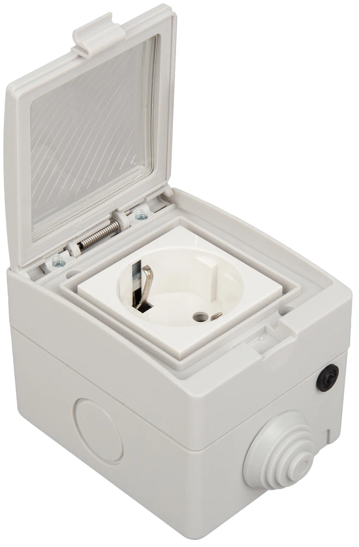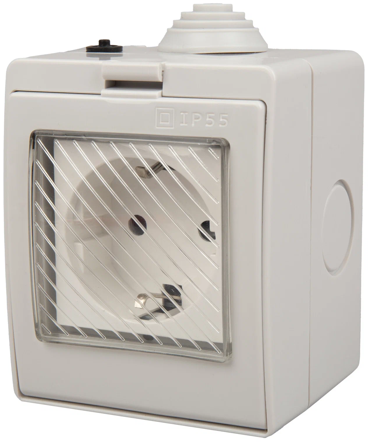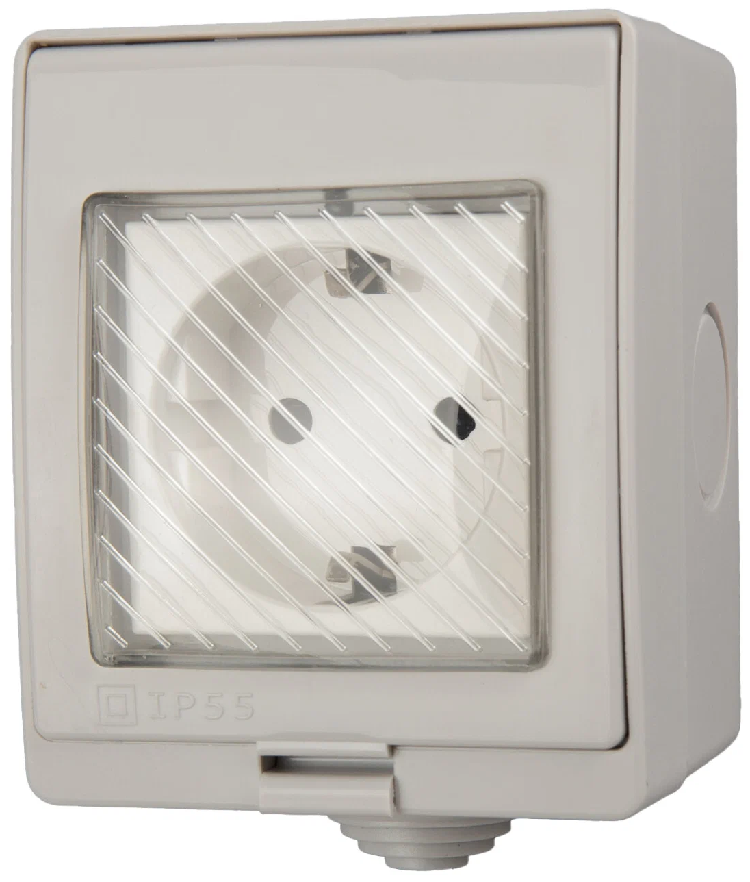 Благодаря степени защиты IP55 розетка не боится влаги и подходит для установки в сырых помещениях и на улице.