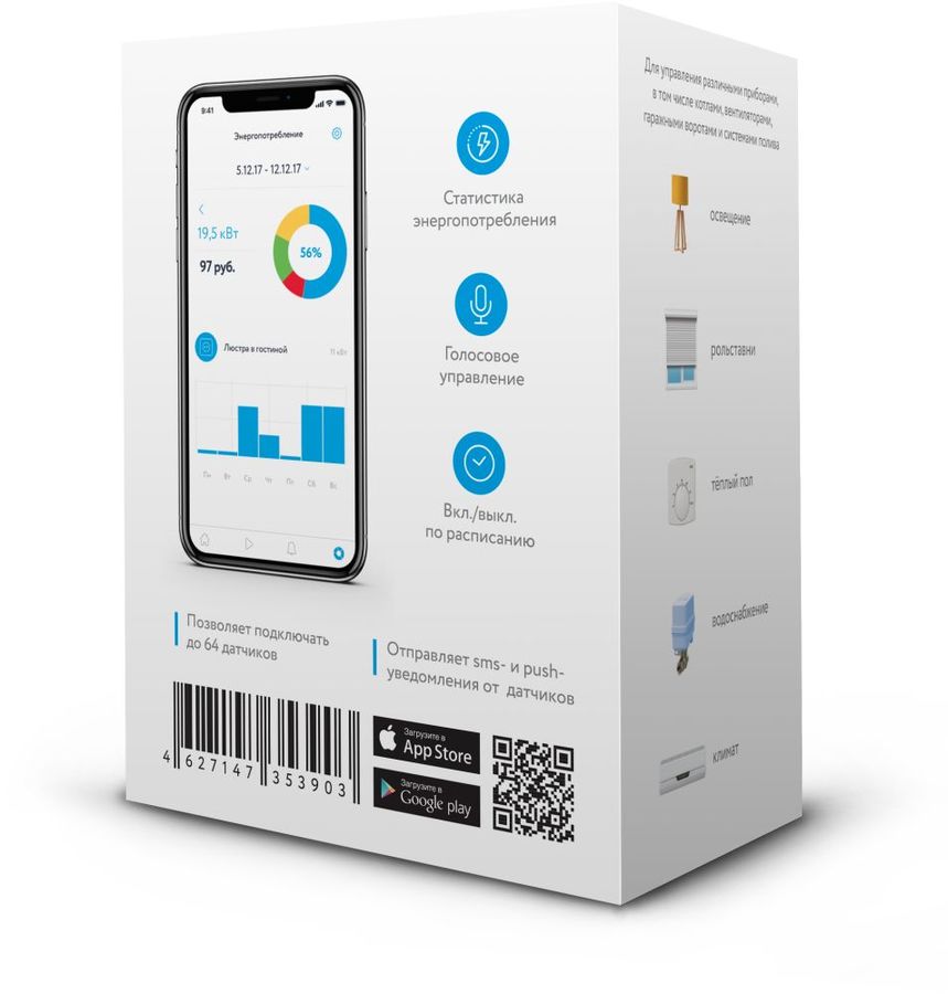 Описание: Управляйте с помощью мобильного приложения освещением и электроприборами. Управляйте голосом на Android и Apple. Настраивайте таймеры по расписанию. Подключайте до 64 датчиков. Получайте sms- и push-уведомления при срабатывании датчиков. Создавайте сценарии управления.