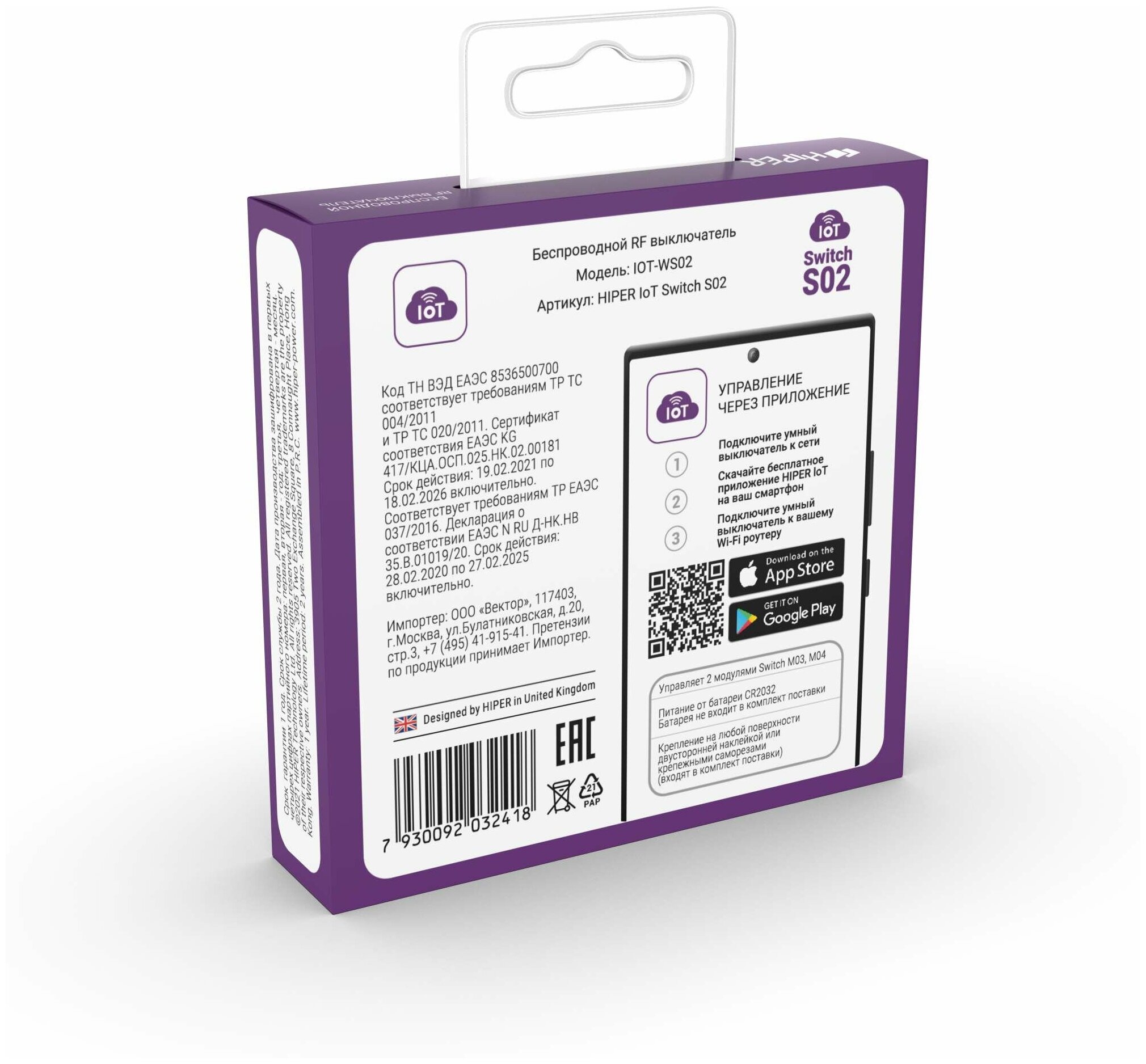 HIPER IoT Switch S02 – это беспроводной RF выключатель, предназначенный для управления 2 умными Wi-Fi модулями Switch M03, Switch M04.