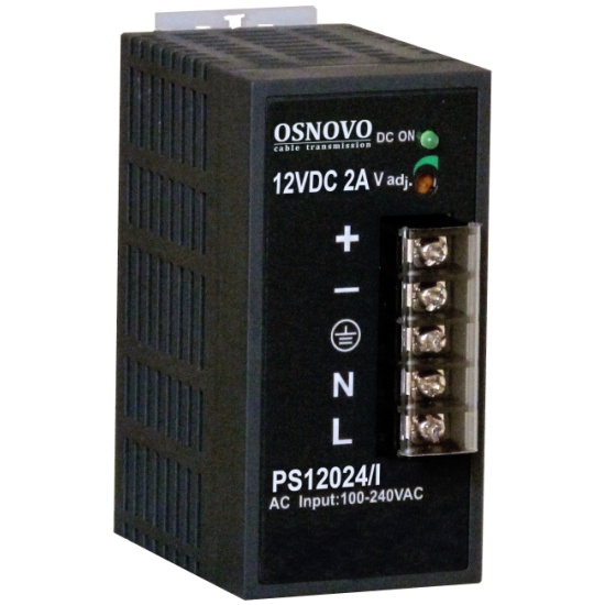 Промышленный блок питания. DC12V, 2A (24W). Диапазон входных напряжений: AC100-240V. КПД: 80%. Защита от короткого замыкания, перенапряжения и перегрузки. Конвекционное охлаждение. Монтаж на DIN-рейку или стену. Размеры (ШxВxГ): 45x96x75мм. Рабочая температура: -40...+50°C.
