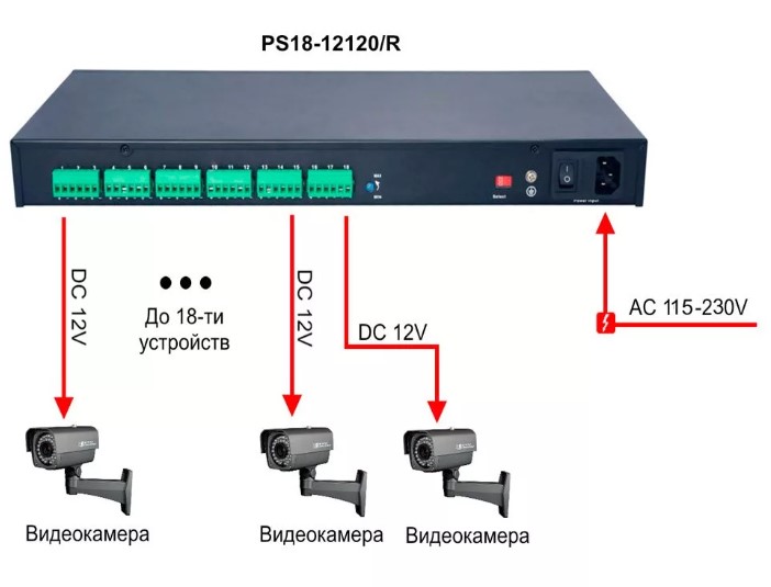 Блок питания на 18 каналов OSNOVO PS18-12240/R предназначен для монтажа в 19" стойку 1U, DC 12V, 1,11А на канал(макс ток до 2А, при одновременном использовании не более 10 каналов), суммарно до 20А. Общая выходная мощность до 240Вт. Допускается кратковременная нагрузка на канал 4А(5 сек).