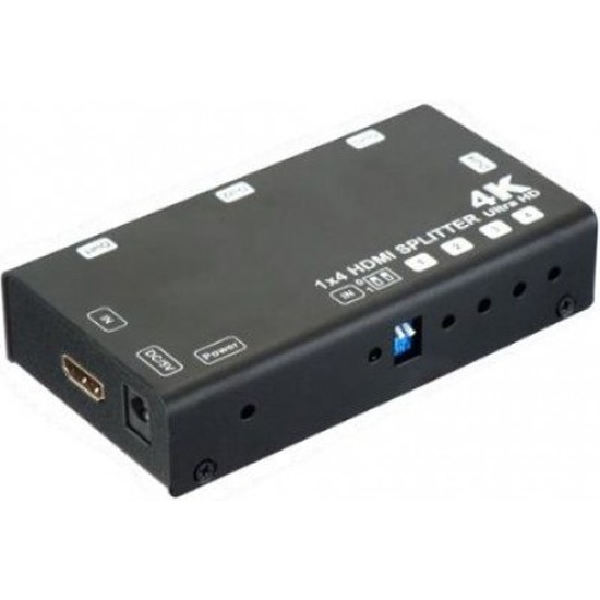 Разветвитель HDMI (1вх./4вых.). Разрешение до 1080p, 36бит(Deep Color) и 4K(60Гц), 4:2:0. Поддержка 3D и HDCP. Скорость передачи данных до 10,2Гбит/с. Расширенные настройки EDID. Вх. - HDMI(A)/Роз.2,1х5мм(DC5V). Вых. - HDMI(A)x4. В комплекте БП DC5V(1А). Размеры (ШxВxГ): 115x25x62мм. Рабочая температура -5…+35°С.