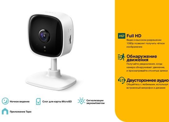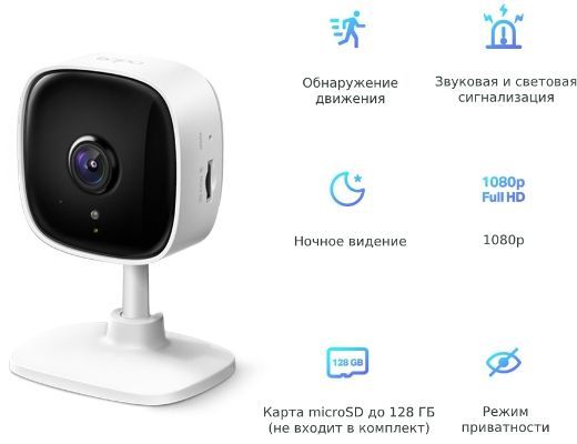 Описание: Видео в разрешении 1080p. Ночное видение на расстоянии до 9 м. Push-уведомления на смартфон при обнаружении движения. Звуковая и световая сигнализация для незваных гостей. Встроенный микрофон и динамик. Хранение до 128 ГБ на карте microSD. Простая настройка и управление с помощью приложения Tapo