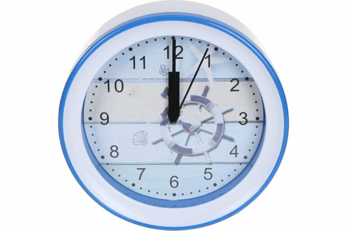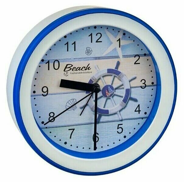 Форма: круглая; Размещение: настенные; Цифры: арабские; Механизм: кварцевые; Материал корпуса: пластик; Особенности: будильник; Цвет: белый/синий; Размер: 15.3х15.3х4.2 см;