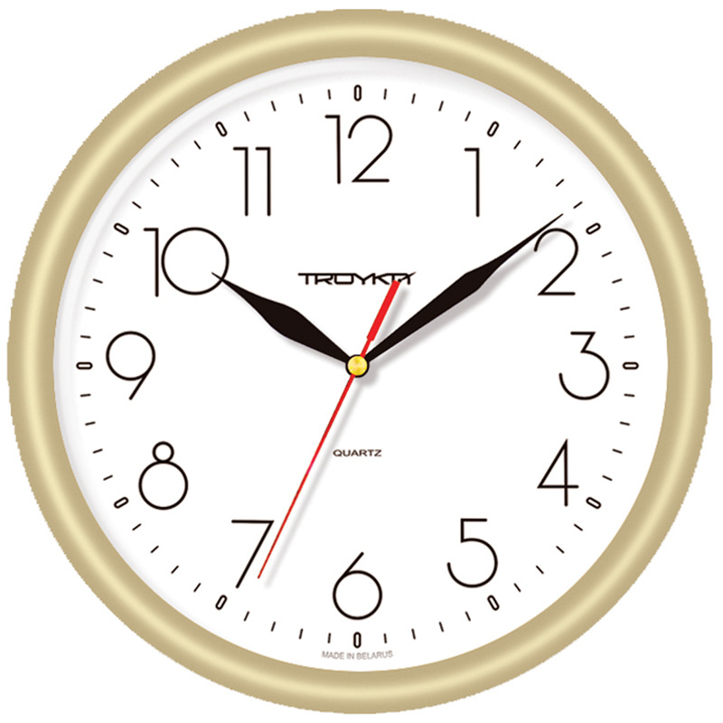 Часы настенные Troyka 21271212. Материал корпуса - пластик. Циферблат закрыт прочным пластиком. Механизм c плавным ходом. Диаметр - 240 мм. Часы работают от 1 элемента питания типа АА.
