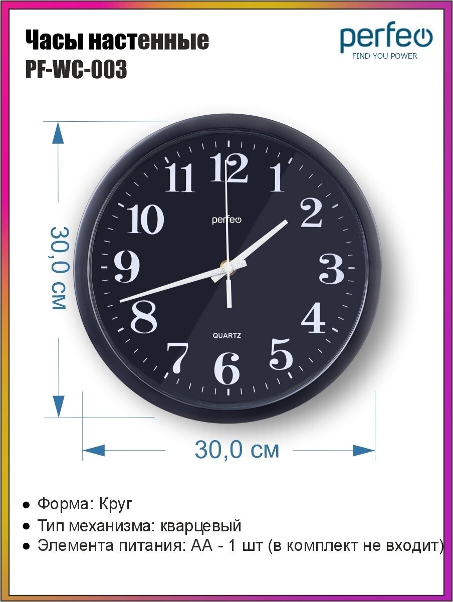 Часы настенные. Тип механизма: кварцевый с плавным ходом. Материал корпуса: пластик. Циферблат защищён стеклом. Незаметное крепление на задней части корпуса обеспечит надежный монтаж на стену и удобное снятие часов при необходимости замены элементов питания.